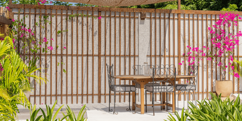 • a garden with lush greenery and dining area