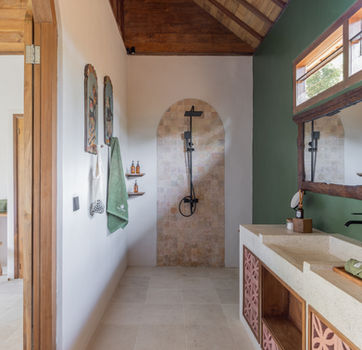 • 1 outdoor bathroom: open-air shower, vanity area, hot water, tropical landscaping (with toilet inside)